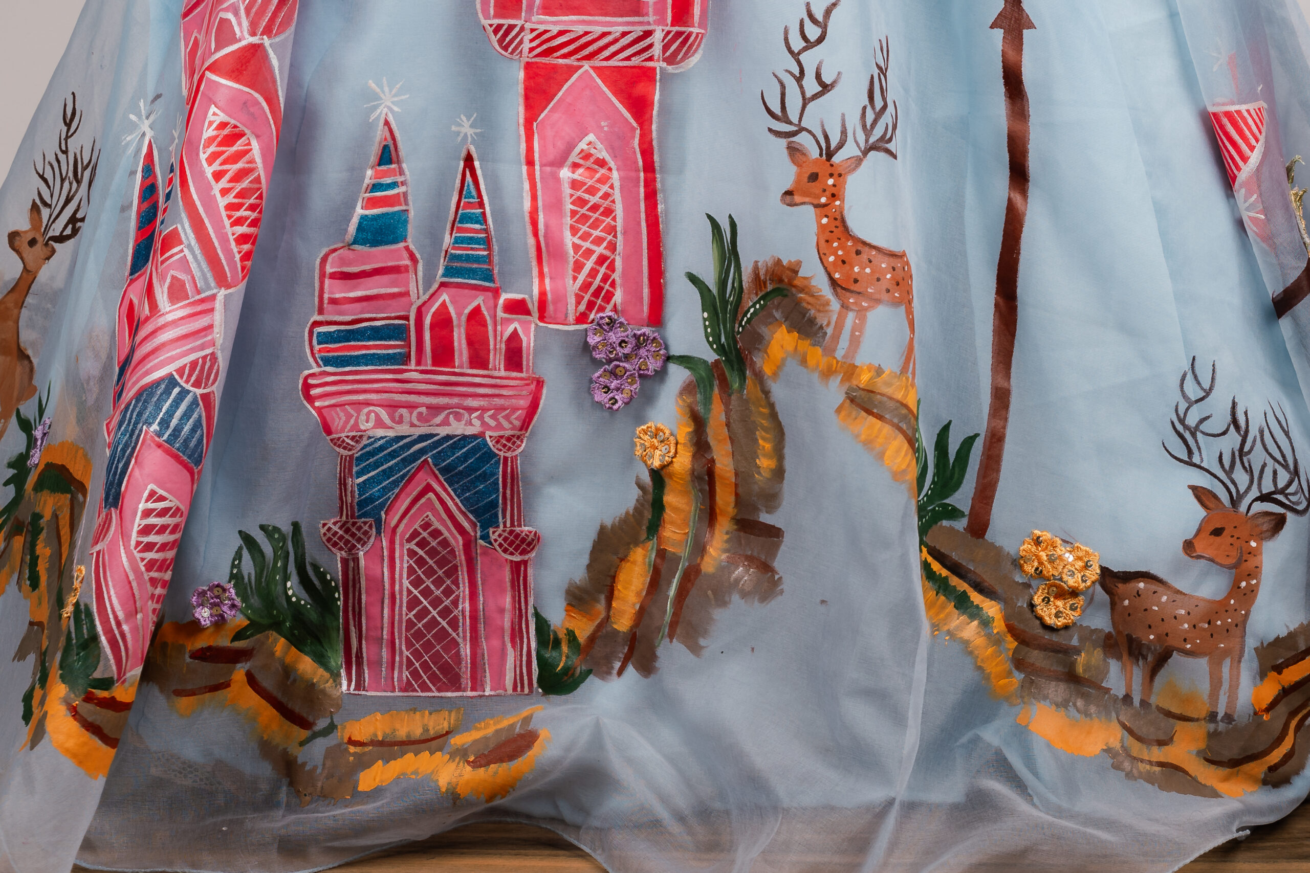 Castle Blue is a sky-blue one-shoulder lehenga featuring delicate hand-painted castles and graceful deer. Inspired by enchanted gardens and storybook realms, each detail reflects artistry and quiet luxury. The flowing silhouette and soft hues create an elegant piece designed for magical celebrations and unforgettable moments.