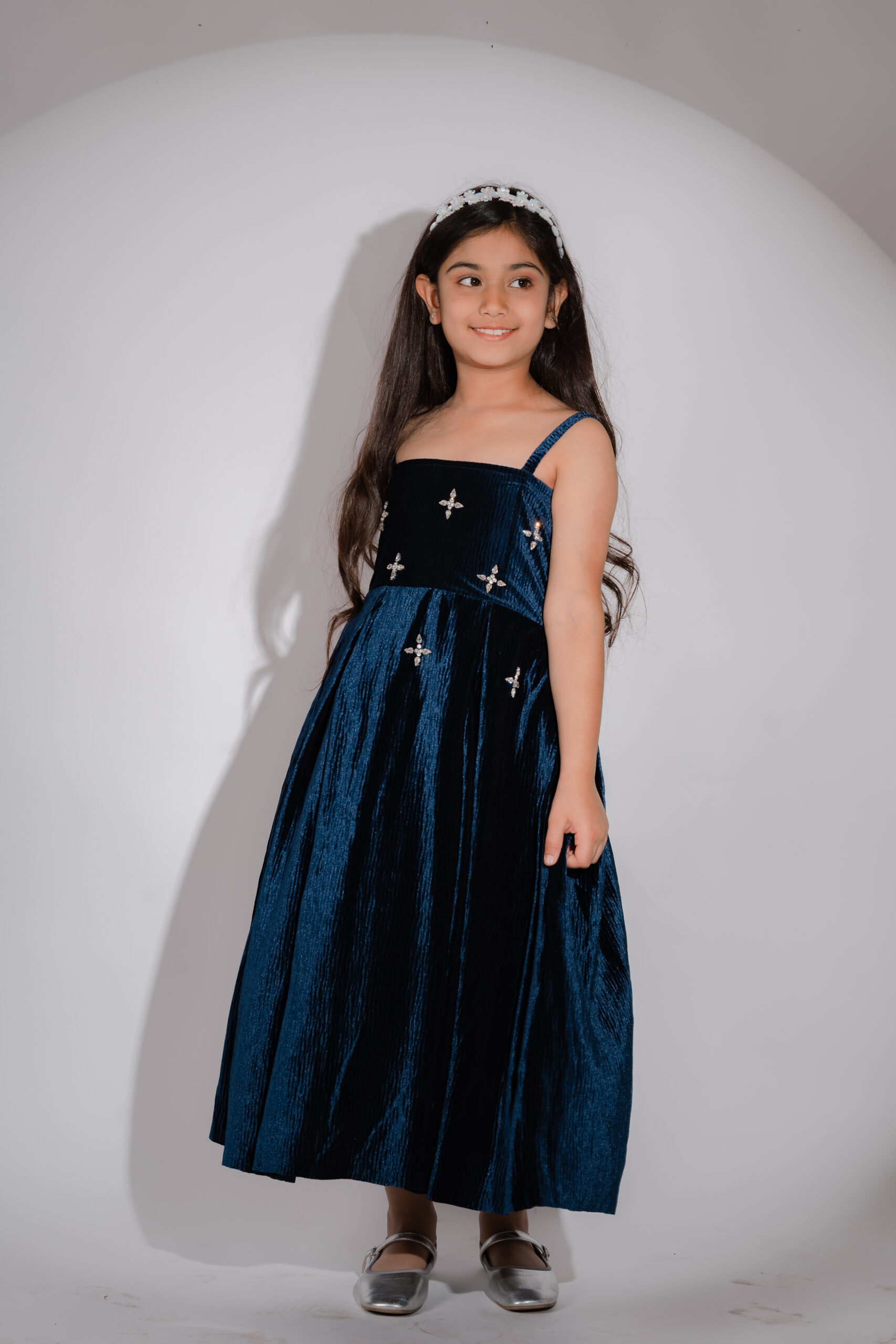 Graceful midnight blue dress with star details, perfect for magical celebrations, with stud detailing made to shine!
