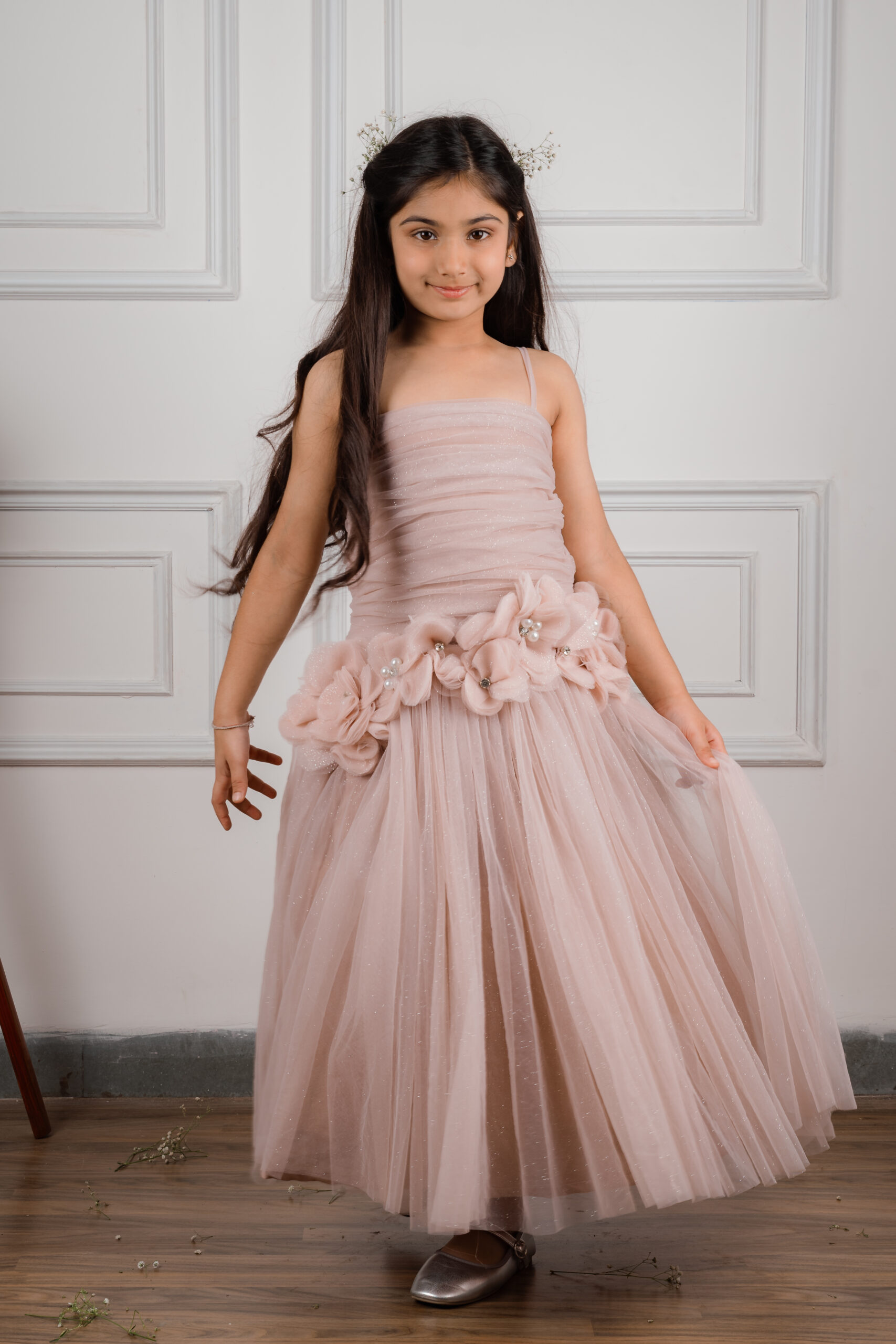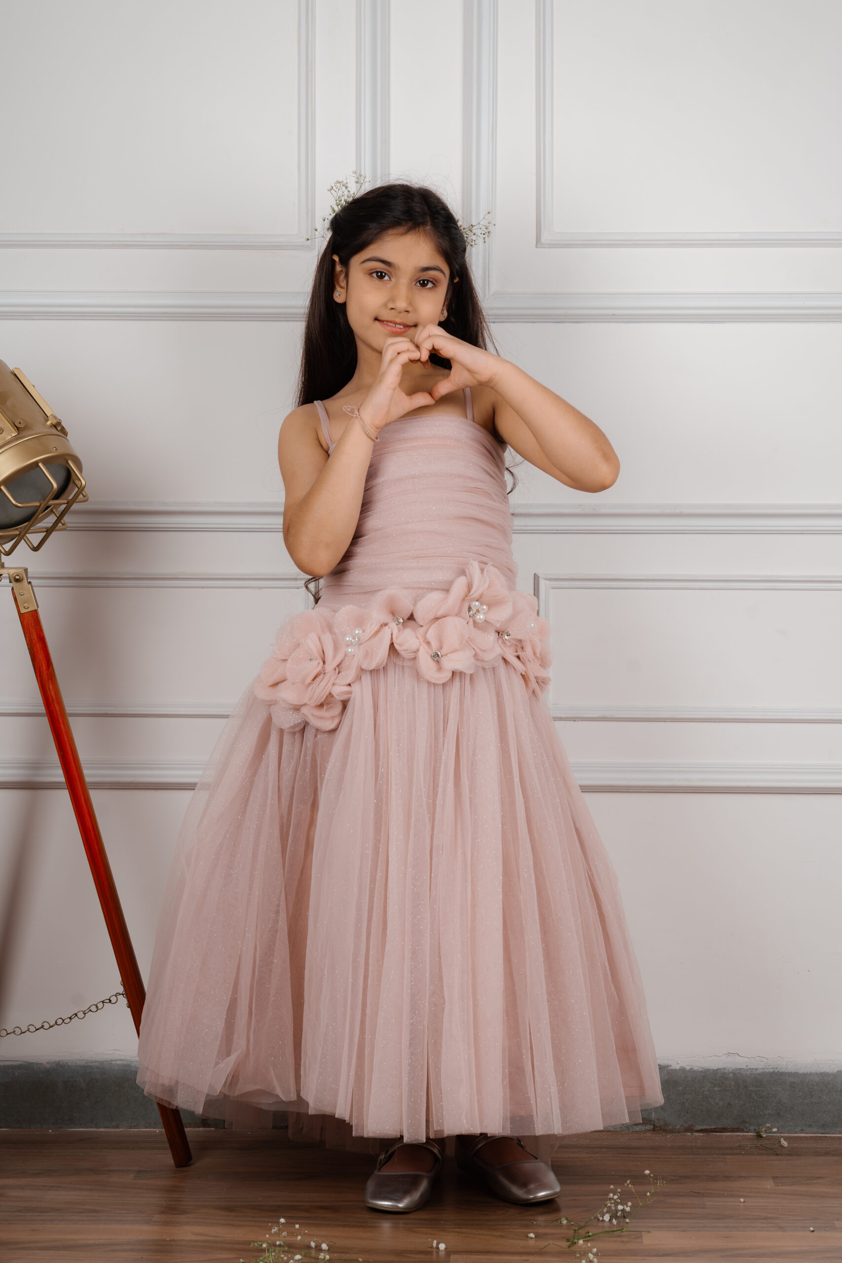 pastel pink shimmer net dress designed to feel light, graceful, and timeless. The softly glowing fabric catches the light with every movement, while delicate floral accents at the waist add a romantic, garden-inspired touch. Elegant yet whimsical, this dress is crafted for special moments where luxury meets fairytale charm. A refined piece that feels like a whisper from a storybook garden.