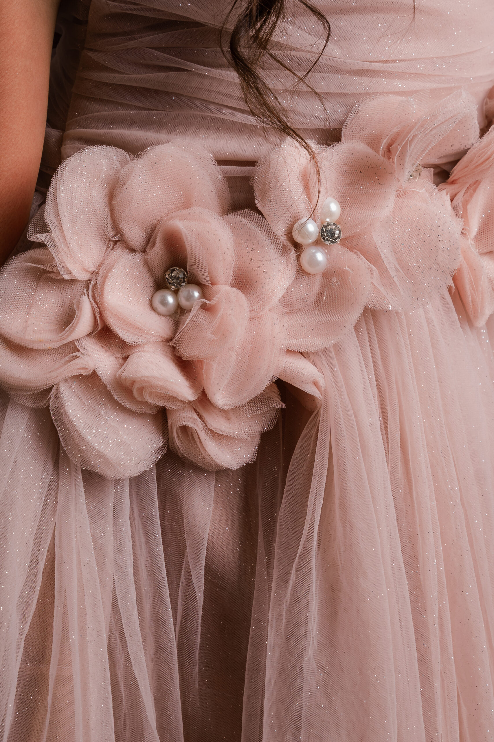 A pastel pink shimmer net dress with delicate floral detailing at the waist, inspired by the quiet beauty of an enchanted garden.