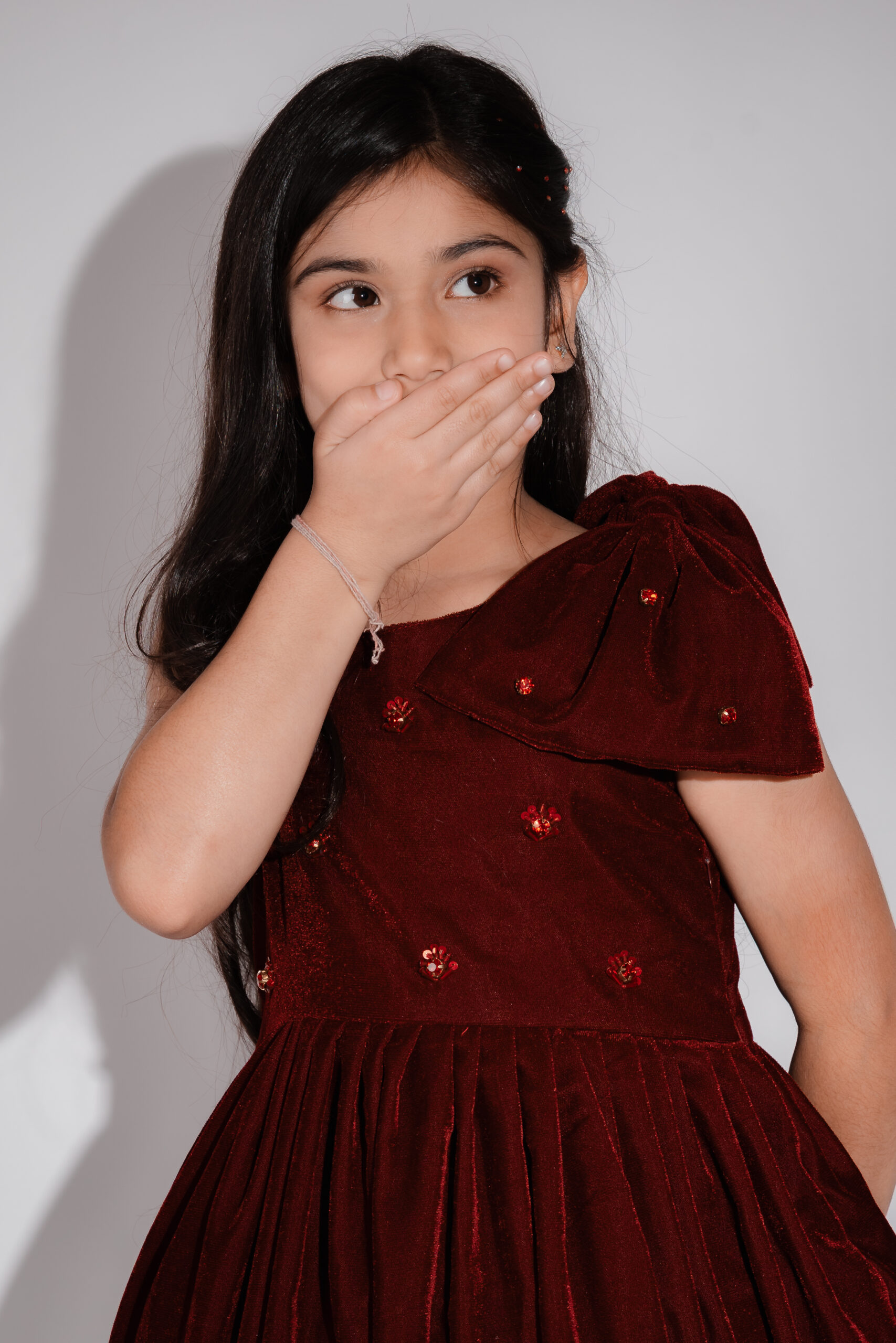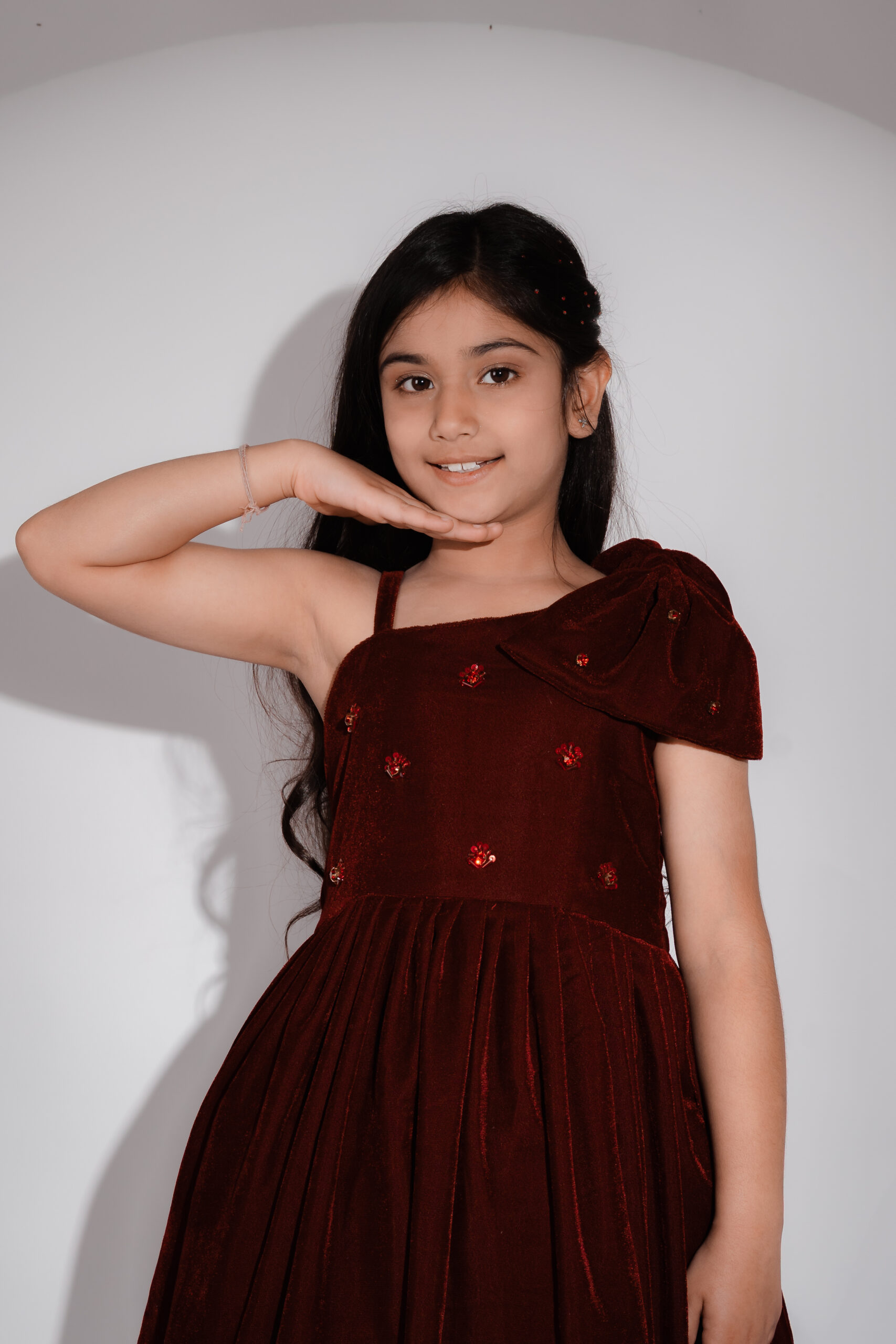 A luxurious maroon velvet dress with an elegant shoulder bow and subtle sparkling studs, inspired by fairy-tale gardens and timeless enchantment.